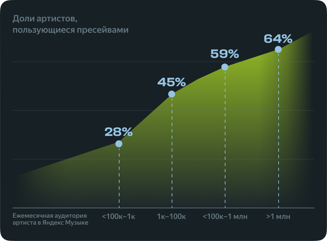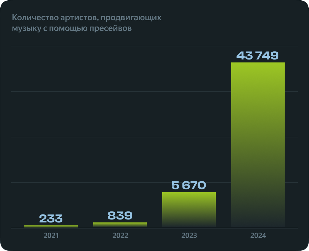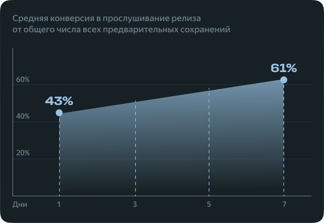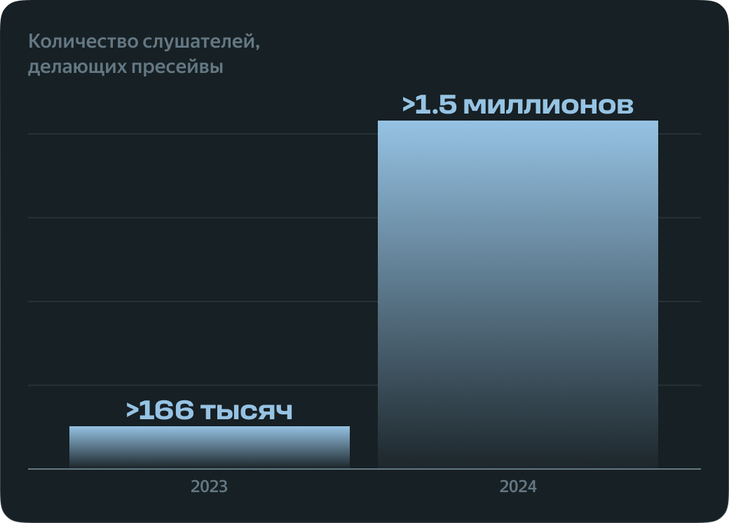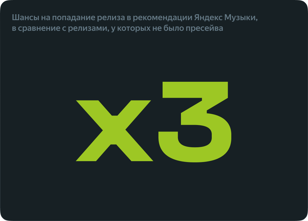 Использование пресейва помогает артистам собрать первые лайки и прослушивания сразу после выхода новинки. Это — наряду с другими активностями вокруг нового релиза — становится сигналом для Моей волны о том, что релиз интересен слушателям, и в 3 раза повышает шансы на попадание музыки в рекомендательную систему — по сравнению с релизами, у которых не было пресейва.