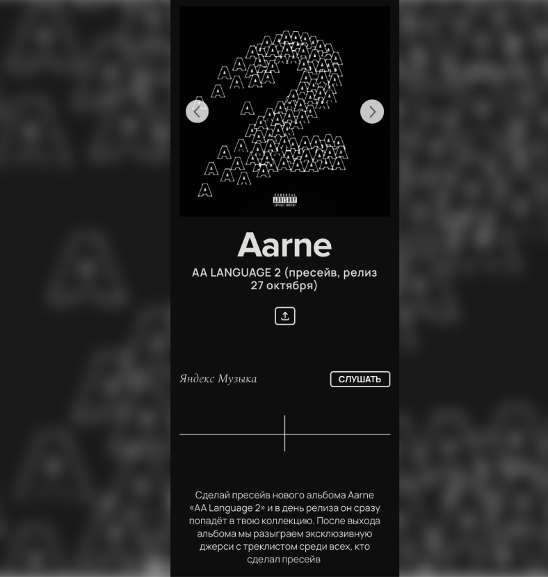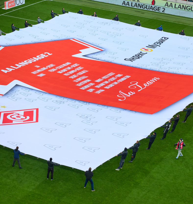 пресейв «AA LANGUAGE 2» в BandLink. Сам Aarne открыл матч, исполнив трек «Вместе». В момент выступления был анонсирован альбомный треклист: артист вместе с Яндекс Музыкой придумал растянуть на поле баннер с гигантским джерси со списком музыкантов «AA LANGUAGE 2». Команда артиста неспроста выбрала спортивную коллаборацию: во-первых, Aarne уже много лет болеет за «Спартак», а во-вторых, среди российских артистов ещё никто не презентовал релиз во время футбольного матча.