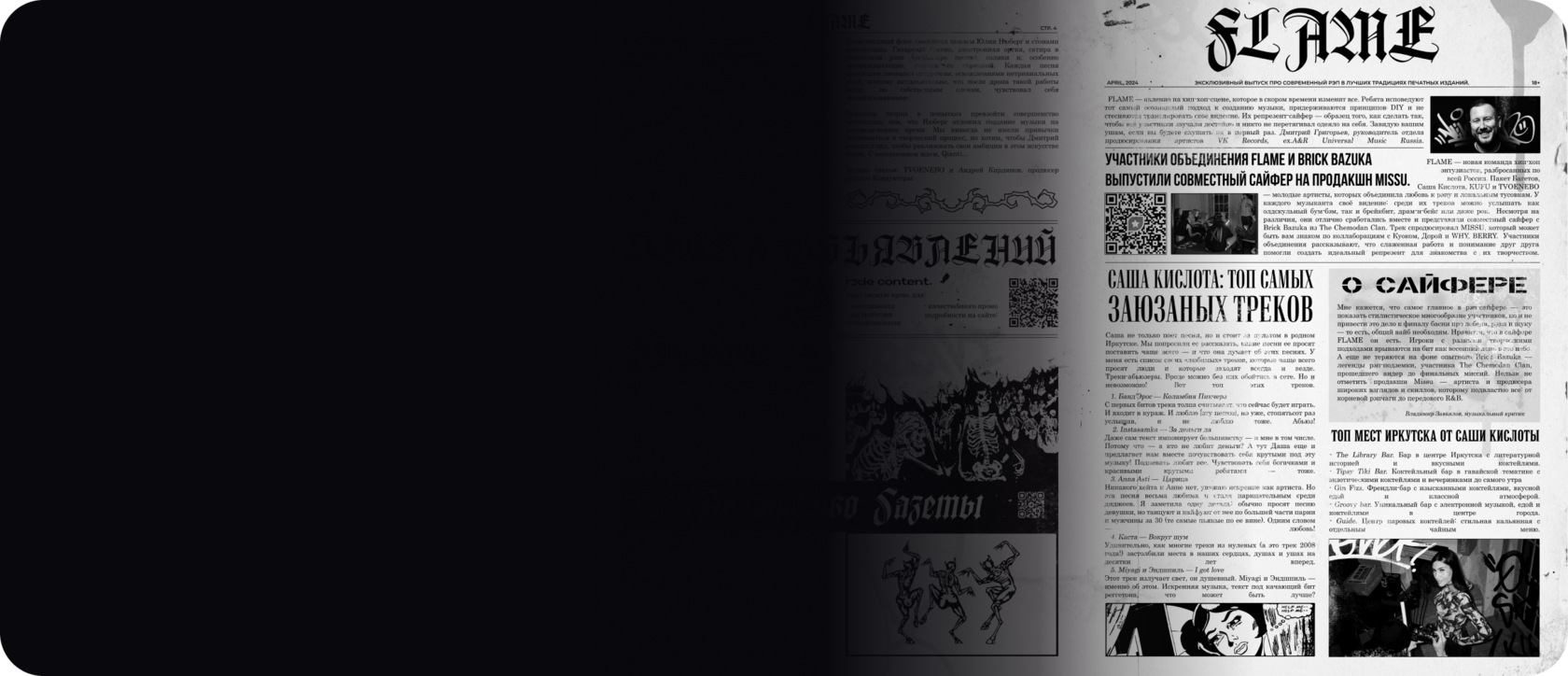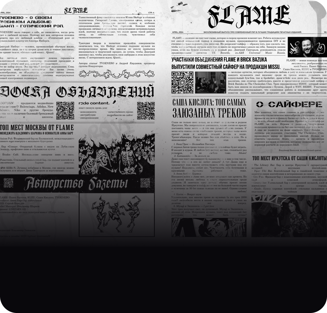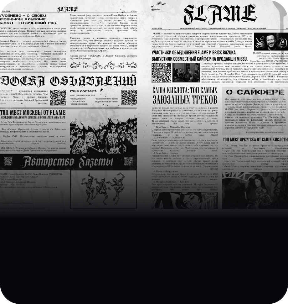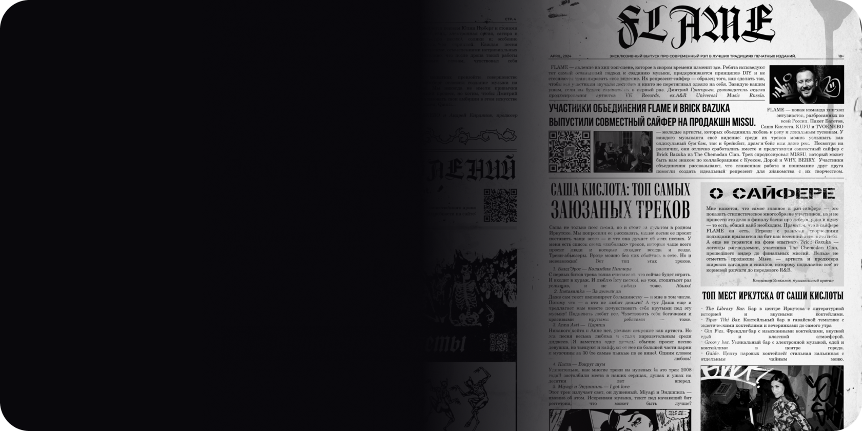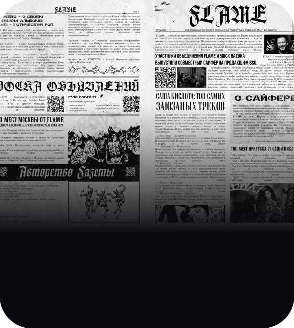 Весной участники творческого объединения FLAME и Brick Bazuka выпустили совместный сайфер на продакшн MISSU. Чтобы подсветить артистов объединения и релиз, команда придумала напечатать фирменный самиздат. По словам команды промо, идея сделать стилёвый самиздат появилась у основателей FLAME давно, но не было подходящего повода для её реализации. Запускать газету на постоянной основе не хотелось, но когда возникла идея релизнуть сайфер с участием всех артистов FLAME из разных городов, самиздат органично вошёл в проект.